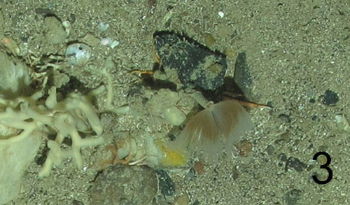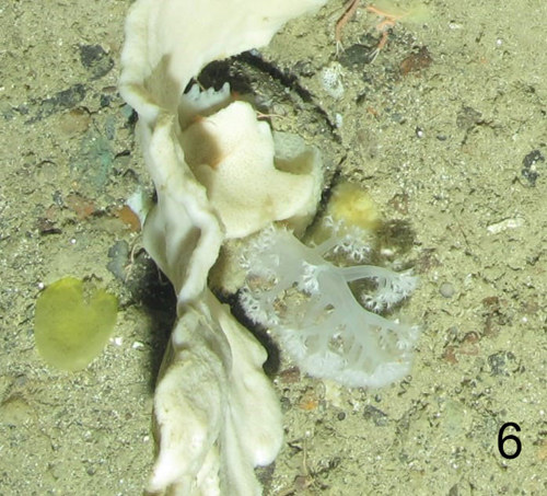 For example, we have seen many different types of filter feeder including bryozoans (photo 1), anemones (photo 2), tube worms (photo 3), feather stars (photo 4) and basket stars (photo 5) which all get their food by sieving tiny planktonic animals that drift past in the deep ocean currents and food particles that rain down from the surface waters as marine snow. Bryozoans, like the lace-like bryozoan, are colonial organisms. The colony is made up of many genetically identical animals arranged to form a complex structure. Basket stars are relatives of starfish they have five arms, but these repeatedly branch and some fully grown specimens can have as many as 5,000 arm tips! We have also seen cold water soft corals like the ‘cauliflower coral’ (photo 6) which can act as habitat for juvenile basket stars.